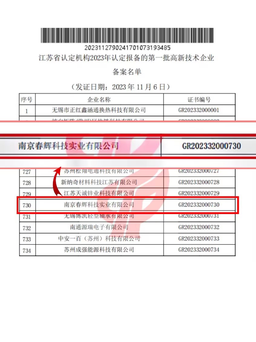 11月27日,根據(jù)《高新技術(shù)企業(yè)認(rèn)定管理辦法》和《高新技術(shù)企業(yè)認(rèn)定管理工作指引》有關(guān)規(guī)定,全國高新技術(shù)企業(yè)認(rèn)定管理工作領(lǐng)導(dǎo)小組辦公室發(fā)布了江蘇省認(rèn)定機(jī)構(gòu)2023年認(rèn)定報(bào)備的第一批高新技術(shù)企業(yè)名單,春輝公司順利通過復(fù)審認(rèn)定,再次被授予國家高新技術(shù)企業(yè)稱號(hào)。