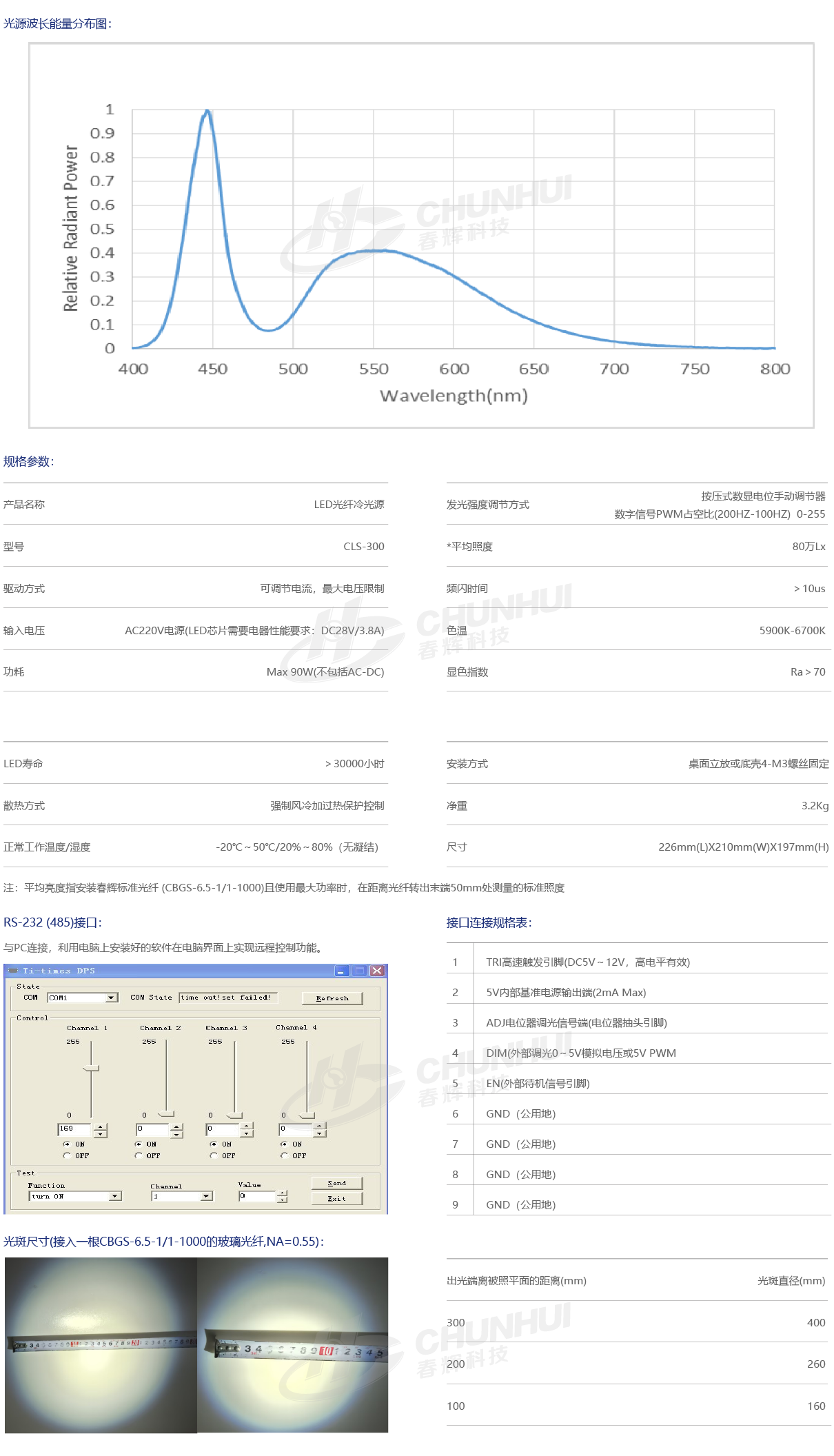 采用超大功率LED芯片,是一款高亮度的LED冷光源,實(shí)現(xiàn)超過(guò)300W金鹵燈光源的光輸出;支持快速觸發(fā)功能,響應(yīng)時(shí)間5us,顯色指數(shù)70 / 90可選;重量輕,功率高,色溫高,顯色性好,能效高,性能穩(wěn)定,噪聲小,壽命長(zhǎng),外型美觀、精巧,便于安裝,手動(dòng)調(diào)節(jié)或?qū)嵭?/span>RS-232(D89)接口遠(yuǎn)程控制,可聯(lián)機(jī)實(shí)現(xiàn)同步控制,可提供多種光纖輸出接口;廣泛用于醫(yī)療,光學(xué),工業(yè),科研等領(lǐng)域。