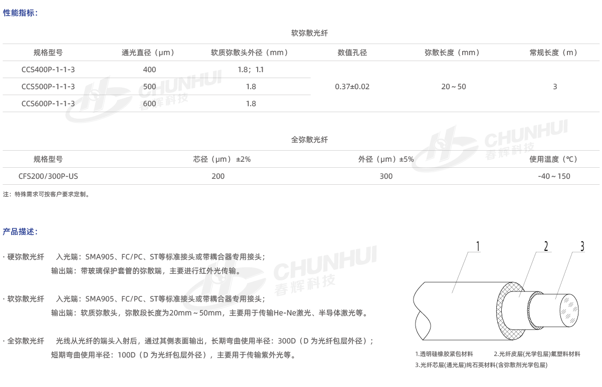 沿徑向均勻輸出光能量的光纖產品,主要分為:硬彌散光纖、軟彌散光纖、全彌散光纖;